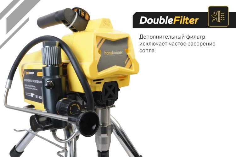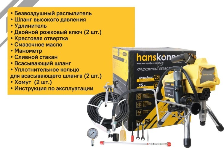 Краскопульт безвоздушный Hanskonner HSG9663B — надежный и продуктивный электроинструмент для нанесения лакокрасочных материалов без использования сжатого воздуха. Из-за большого перепада давления, от 210 Бар в насосе до атмосферного в пространстве, лакокрасочный материал дробиться на мельчайшие частицы и в виде аэрозольного факела оседает на окрашиваемой поверхности. Данная модель отличается качественной механической системой управления давлением, что дает возможность осуществлять интерьерную покраску.