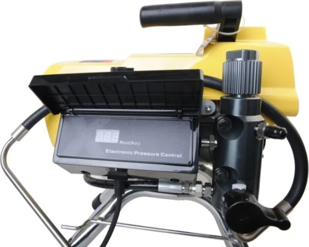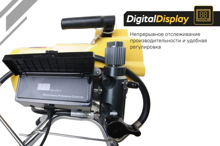 Электронная система управления давлением позволяет точно поддерживать заданные параметры, что улучшает качество покраски и однородность наносимого слоя материала.