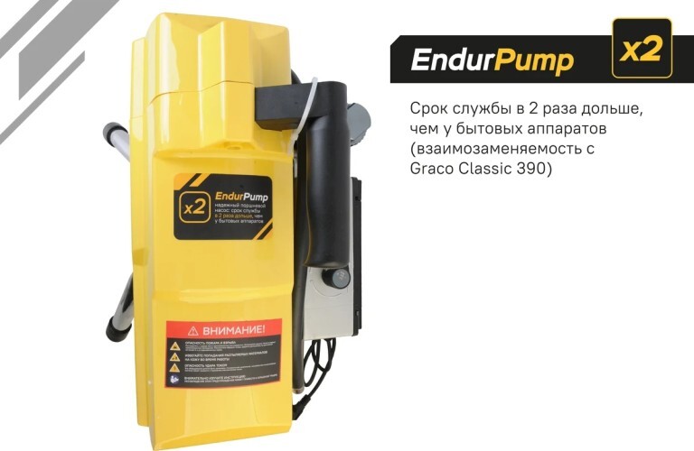 Надежный поршневой насос: срок службы в 2 раза дольше, чем у бытовых аппаратов (взаимозаменяемость с Graco Classic 390).