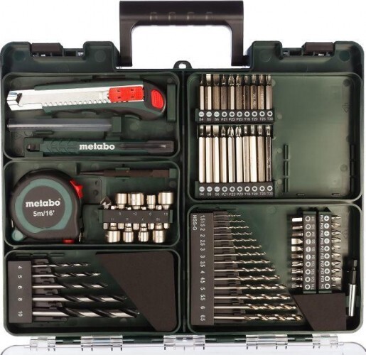 пластиковый кофр с различными принадлежностями для сверления, завинчивания и многого другого