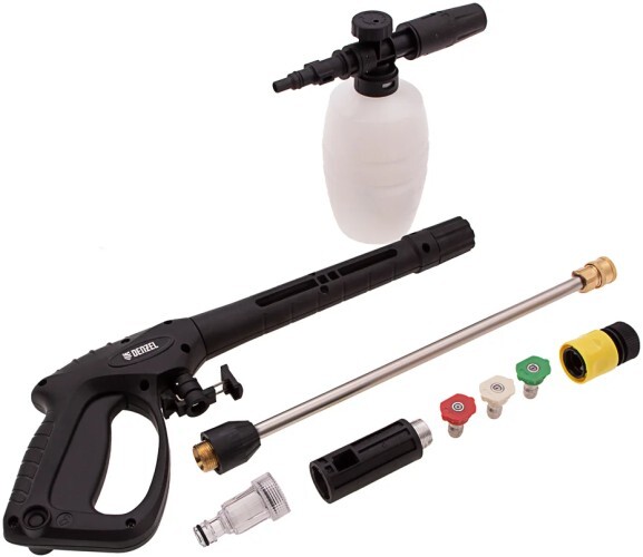 быстросъемные форсунки (входят в комплект) позволяют подобрать оптимальный режим, а насадка-удлинитель — мыть рельефные поверхности