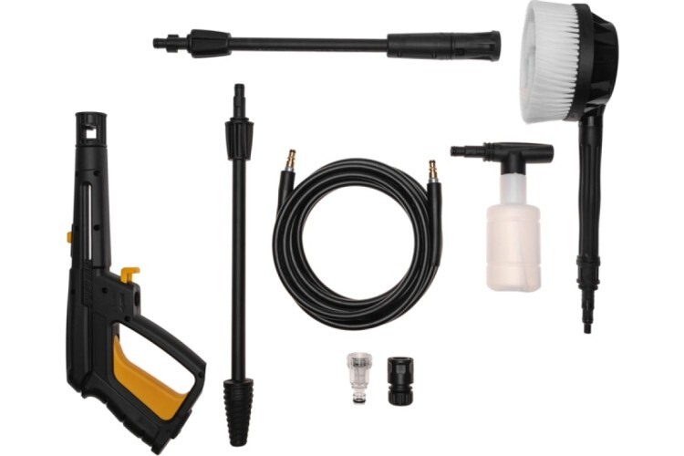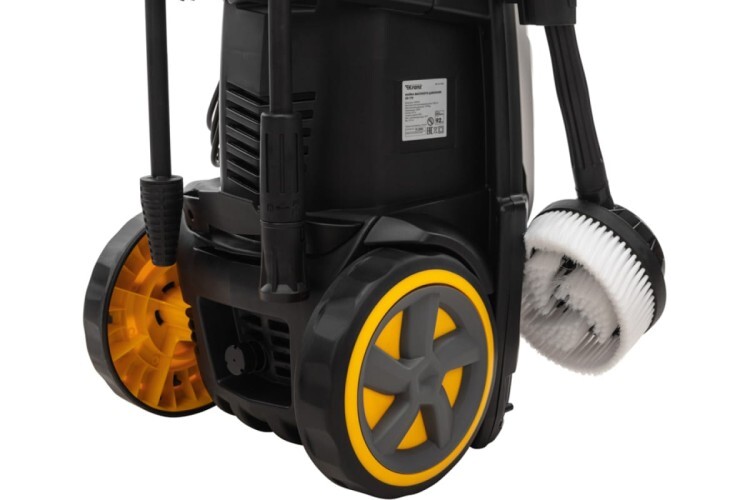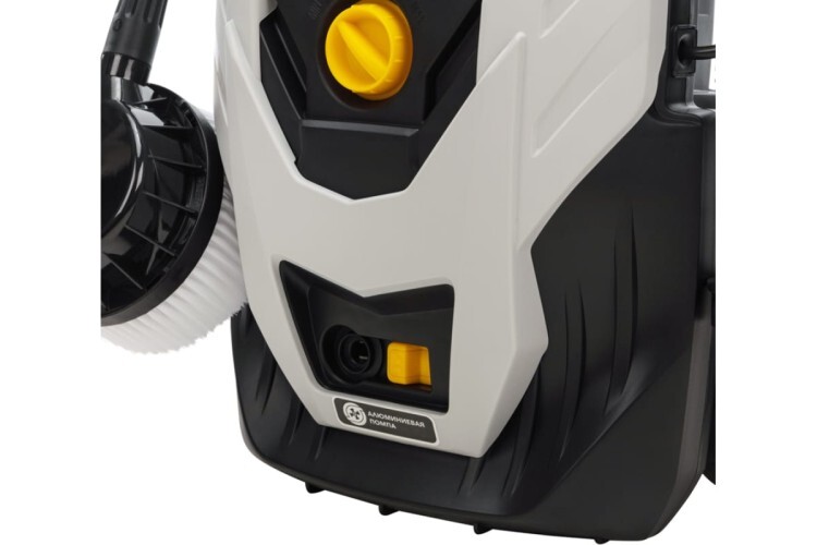На корпусе мойки располагается держатель пистолета и распылителя, а также встроенный крюк для крепления провода. Предусмотрены быстросъемные коннекторы фиксации шланга и насадок.