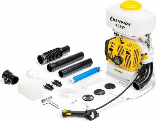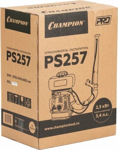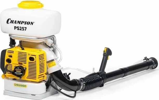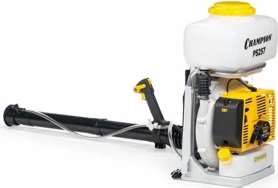Опрыскиватель Champion PS257 - профессиональный инструмент, необходимый в сельском и жилищно-коммунальном хозяйстве для опрыскивания растений средствами от паразитов, распределения удобрений и подкормки и других работ, связанных с распылением жидких материалов. Кроме того опрыскиватель PS257 подходит для распыления гранулированных веществ: удобрений или семян (данная возможность является опцией и приобретается отдельно). Опрыскиватель оснащен 2-тактным двигателем мощностью 3.4 л.с. Двигатель заправляется топливной смесью, которая состоит из бензина марки не ниже АИ-90 и масла для 2-тактных двигателей в соотношении 50:1. Топливный бак емкостью 1.5 л выполнен из прозрачного материала, поэтому контролировать уровень топлива очень легко. Двигатель обеспечивает широкий, до 15 метров радиус распыления, что позволяет за короткий промежуток времени обработать большую территорию. Скорость распыления оставляет 182 л/час. Опрыскиватель Champion PS257 оснащен емким 14-литровым баком для распыляемого раствора и экономичным двигателем. Это позволяет эксплуатировать оборудование долгое время, без остановки на пополнение запасов раствора и топлива. Сравнительно небольшой вес агрегата (11,3 кг), эргономичная форма и удобные ремни для ношения опрыскивателя в виде ранца повышают удобство эксплуатации и дают возможность пользователю выполнить большой объем работы без перерывов на отдых.