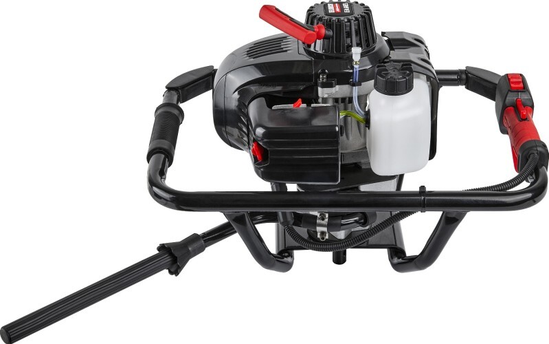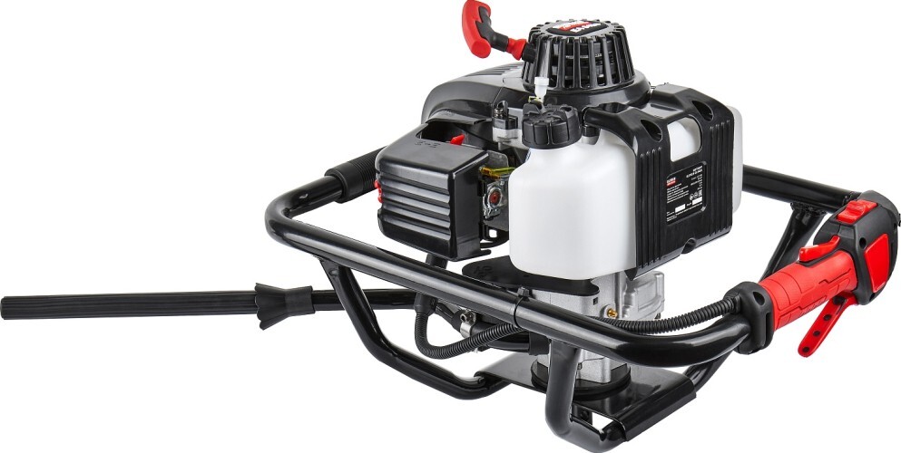 Бензиновый мотобур с двухтактным двигателем мощностью 3 л.с. (2,2 кВт) и передаточным числом редуктора 30 к 1, предназначен для бурения грунта и льда шнеком диаметром от 40 мм до 200 мм на глубину до 1,8 метров. При эксплуатации мотобура необходимо правильно выбрать тип шнека (для грунта, для мерзлого грунта или для льда). Шнеки для разных типов грунта отличаются режущей головкой.