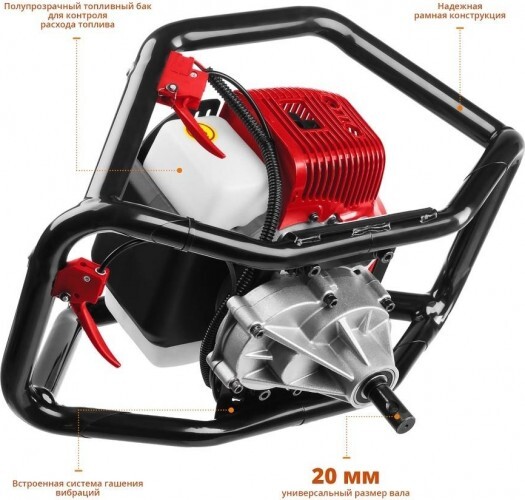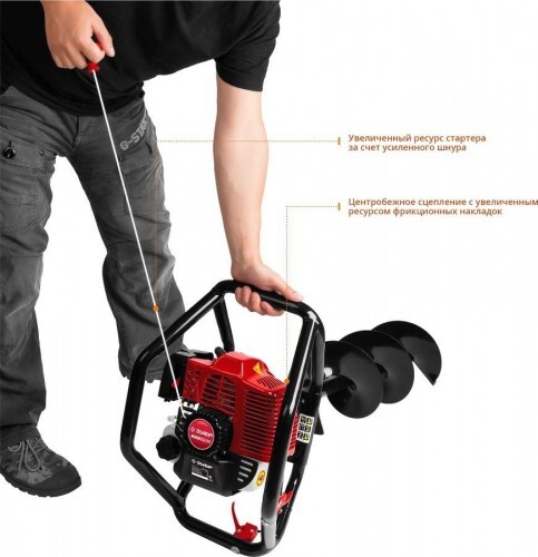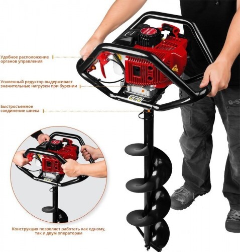 Универсальный мотобур оптимален к применению при монтаже столбов, заборов, ограждений и других целей связанных с бурением грунта. Конструкция рукоятки позволяет работать как одному оператору, так и двум одновременно, что повышает эффективность бурения и обеспечивает дополнительную сохранность двигателя при работе и транспортировке.