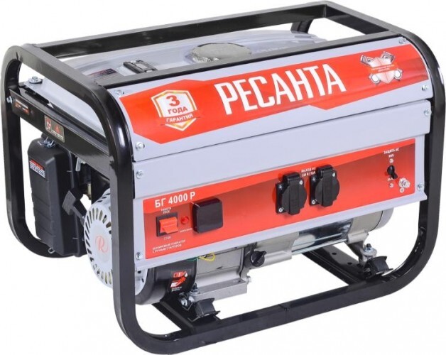 Электрогенератор Ресанта БГ 4000 Р предназначен для автономного электроснабжения потребителей бытового назначения. Электрогенератор бензиновый однофазный, выходная мощность 3000 Вт, выходное напряжение 220 Вольт. В качестве первичного источника используется карбюраторный двигатель, топливом для которого является неэтилированный бензин. Электрогенератор БГ 4000 Р имеет номинальную мощность 3 кВт, данной мощности хватает, чтобы питать отдельные потребители, или несколько потребителей. Полная (сумма активной и реактивной) мощность всех подключаемых потребителей в стационарном режиме не должна превышать значения номинальной мощности. При подключении потребителей с большими пусковыми токами (электроинструмент, насосы и т.д.) необходимо учитывать значения пусковых токов.