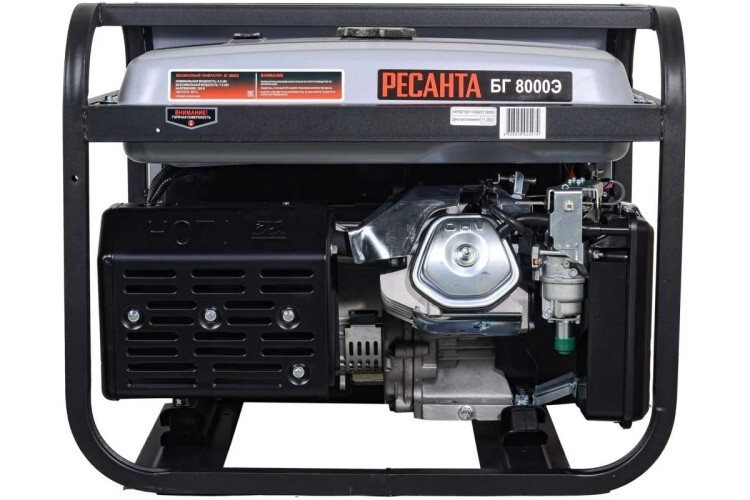 Электрогенератор Ресанта БГ 8000 Э предназначен для автономного электроснабжения потребителей бытового назначения. Электрогенератор бензиновый однофазный, выходная мощность 6500 Вт, выходное напряжение 220 Вольт. В качестве первичного источника используется карбюраторный двигатель, топливом для которого является неэтилированный бензин. Так же генератор оснащен выходом постоянного тока (12В), предназначенным для зарядки аккумуляторных батарей. Электрогенератор БГ 8000 Э имеет номинальную мощность 6,5 кВт, данной мощности хватает, чтобы питать отдельные потребители, или несколько потребителей. Полная (сумма активной и реактивной) мощность всех подключаемых потребителей в стационарном режиме не должна превышать значения номинальной мощности. При подключении потребителей с большими пусковыми токами (электроинструмент, насосы и т.д.) необходимо учитывать значения пусковых токов.