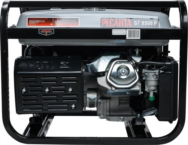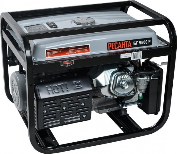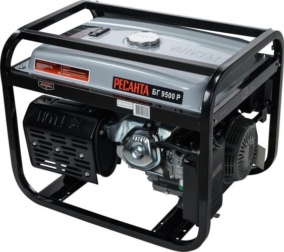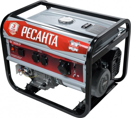 Электрогенератор Ресанта БГ 9500 Р предназначен для автономного электроснабжения потребителей бытового назначения. Электрогенератор бензиновый однофазный, выходная мощность 7500 Вт, выходное напряжение 220 Вольт. В качестве первичного источника используется карбюраторный двигатель, топливом для которого является неэтилированный бензин. Так же генератор оснащен выходом постоянного тока (12В), предназначенным для зарядки аккумуляторных батарей. Электрогенератор БГ 9500 Р имеет номинальную мощность 7,5 кВт, данной мощности хватает, чтобы питать отдельные потребители, или несколько потребителей. Полная (сумма активной и реактивной) мощность всех подключаемых потребителей в стационарном режиме не должна превышать значения номинальной мощности. При подключении потребителей с большими пусковыми токами (электроинструмент, насосы и т.д.) необходимо учитывать значения пусковых токов.