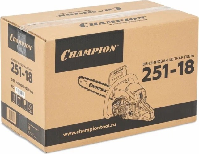 У цепи пилы профессиональный шаг 0,325 дюйма под широкий паз 1,5 мм. Бензопила Champion 251-18 оборудована подогревом карбюратора, позволяющим эксплуатацию при отрицательных температурах. В основании пильной шины есть стальной зубчатый упор, упрощающий распиловку бревен больших диаметров. Подача смазывающего масла на шину и цепь производиться автоматически посредством металлического насоса. Двигатель бензопилы работает на смеси двухтактного масла с бензином в пропорции 1 к 50. Бензопила оборудована системой виброгашения и всеми необходимыми системами безопасности, такими как центробежный тормоз цепи и цепеуловитель.