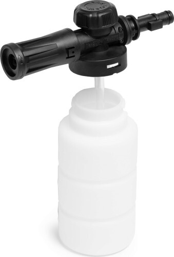 Емкость для моющих средств встроена в корпус мойки, благодаря чему нет необходимости останавливать работу для смены насадок. Подача пены плавно регулируется при помощи встроенной в корпус поворотной рукоятки.