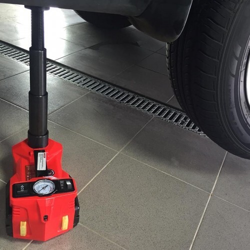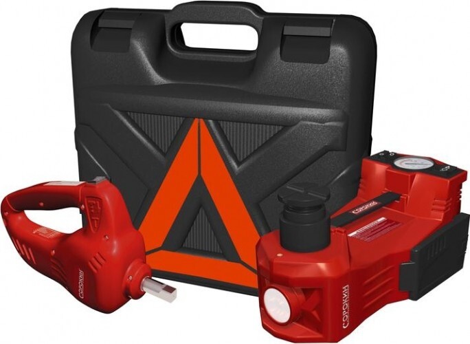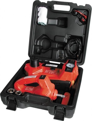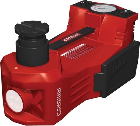 Портативный, многофункциональный электрогидравлический домкрат-компрессор работает от бортовой сети автомобиля и позволяет быстро и безопасно осуществить подъем транспортного средства. Подсветка места установки упростит размещение домкрата. Встроенный компрессор позволит быстро накачать колесо, не меняя положения. В комплекте с электрическим гайковертом замена колеса потребует минимум усилий.