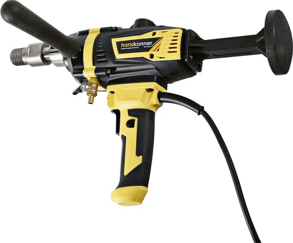 Дрель алмазного сверления Hanskonner HID2180M — компактный и мощный электроинструмент с надежной конструкцией для сверления алмазными коронками отверстий в таких материалах: бетон, железобетон, искусственный и натуральный камень, кирпич. Подключив инструмент к водопроводному крану можно сократить запыленность рабочей зоны, а также износ алмазных коронок и дрели. Данная модель оснащена предохранительной муфтой, срабатывающей при заклинивании коронки, и термозащитой работающей при других видах перегруженности.