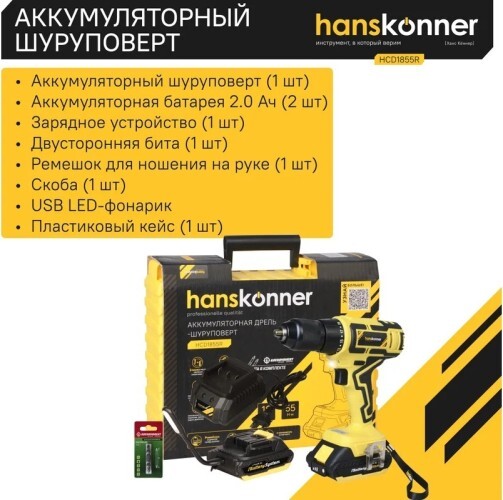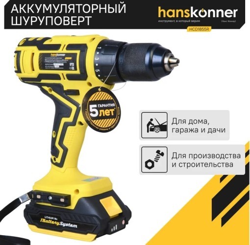 Аккумуляторная дрель-шуруповерт Hanskonner HCD1855R подходит для любых работ, в том числе в стесненных условиях и труднодоступных местах без снижения производительности и потери качества работ.