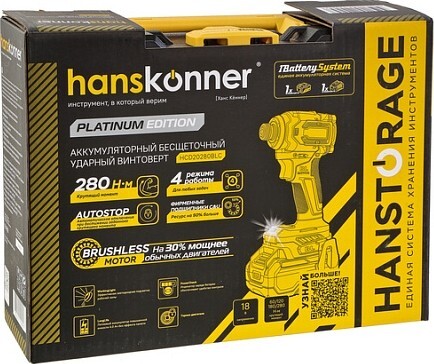 Аккумуляторный ударный бесщеточный винтоверт Hanskonner HCD20280BLC предназначен для ударного закручивания/откручивания различного крепежа. Крутящий момент в 280 Нм и наличие ударного механизма позволяет работать с крепежом больших длин и диаметров (закручивание/выкручивание глухарей, длинных саморезов различных диаметров, сверление толстостенного металла с помощью саморезов со сверлом).