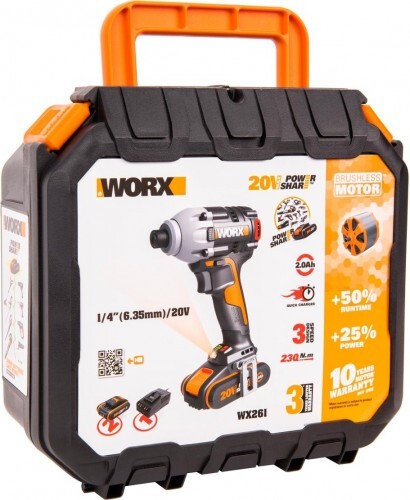 WORX WX261 оснащен бесщеточным двигателем нового поколения, обеспечивающим максимальный крутящий момент 230Нм и скорость вращения шпинделя до 3000 оборотов в минуту и частоту импульсов до 3750 в минуту. Благодаря отсутствию щеток, аккумуляторный винтоверт получил на 25% больше мощности и увеличил ср