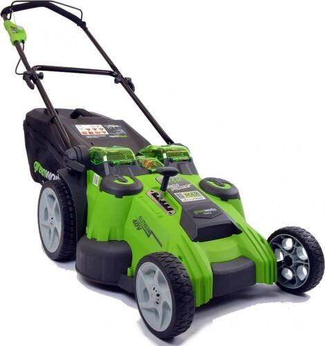 Газонокосилка G-MAX 40V GREENWORKS Twin Force G40LM49DB на текущий момент это сверх новая и уникальная конструкция среди аналогов. Газонокосилка оснащена сразу 2-мя двигателями, 2-мя лезвиями и 2-мя отсеками для батарей. Лезвия на деки расположены не параллельно и вращаются в противоположных направлениях, благодаря чему создается аэродинамический эффект восходящего потока, который поднимает траву непосредственно перед моментом среза. Двигатели на данной модели имеют высокие обороты (5000 об/мин), что упрощает процесс кошения травы и увеличивается коэффициент мульчирования.