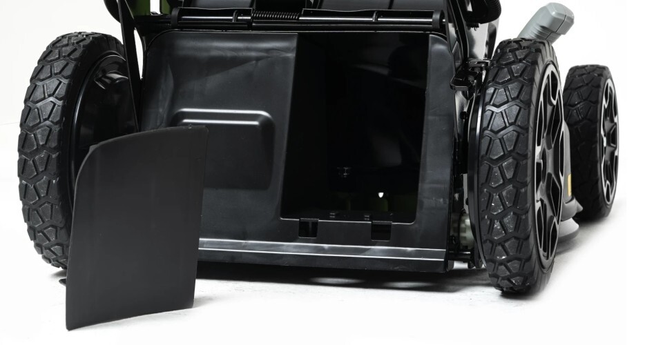 Слот газонокосилки рассчитан на два аккумулятора – основной и дополнительный. После разряда основного аккумулятора, достаточно просто поменять аккумуляторы местами.