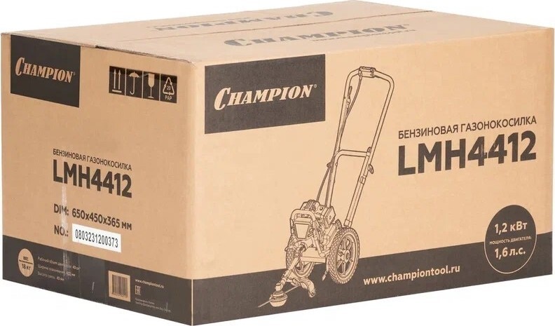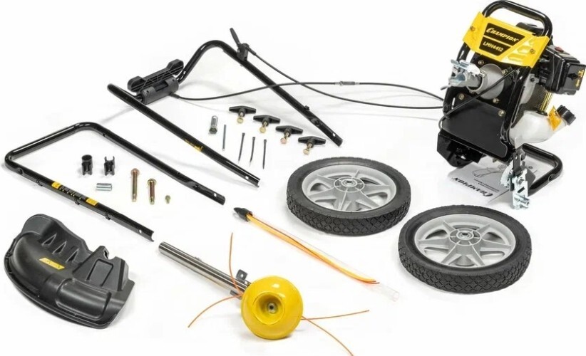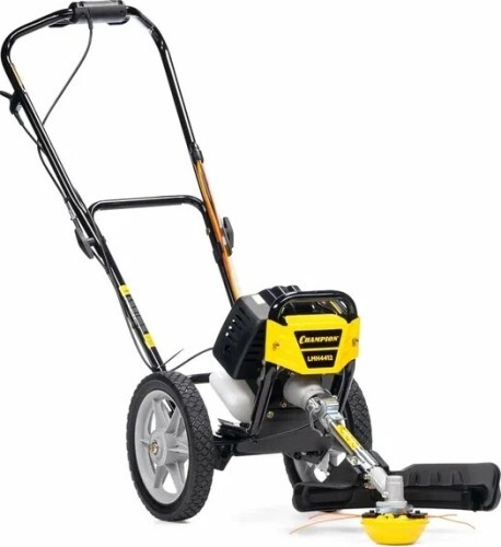 Газонокосилка бензиновая CHAMPION LMH 4412 – весьма интересно сконструированная модель для окашивания неровных участков площадью до 20 соток. Фактически эта модель - это тележка с колесами, к которой приделан обычный двухтактный триммер с укороченной штангой. Такая конструкция технологически легче и проще чем стандартные модели колесных триммеров, но при этом она отлично справляется со своей функцией - уменьшение нагрузки на оператора при работе. Двухтактный двигатель прост в эксплуатации и намного более дешев в ремонте. При этом двухтактный двигатель очень оборотистый, и, не смотря на свою небольшую мощность, показывает довольно хорошую производительность.