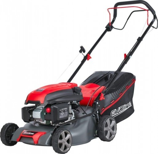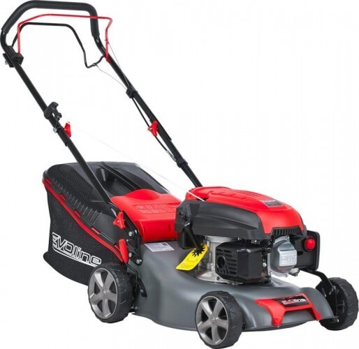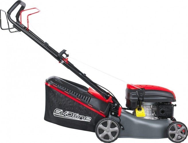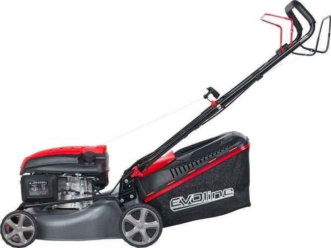 Газонокосилка бензиновая EVOline LMG 42 CS - имеет ширину кошения 42 см и металлическую деку. Двигатель косилки TREX Y145V OHV объемом 145 куб.см и мощностью 3,5 л.с.