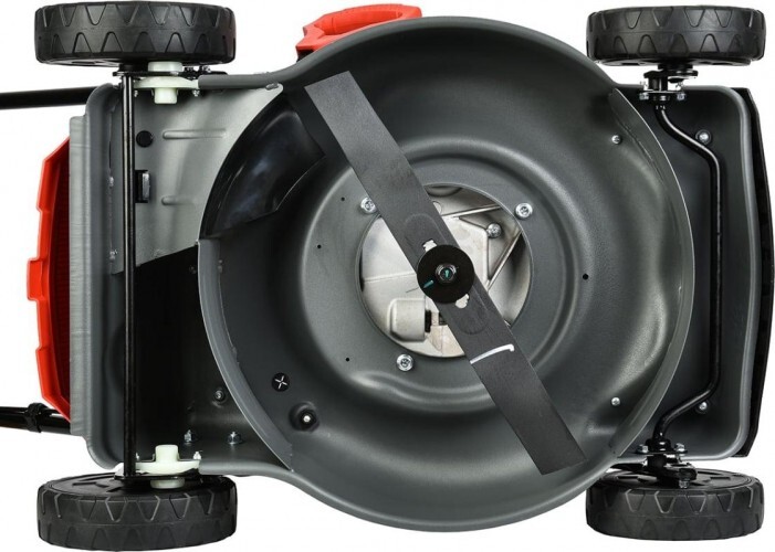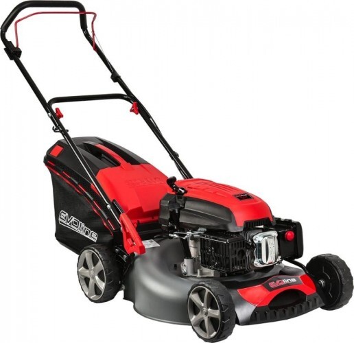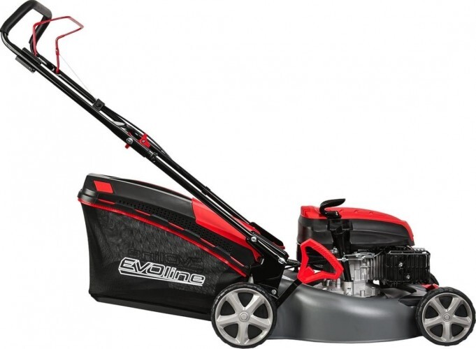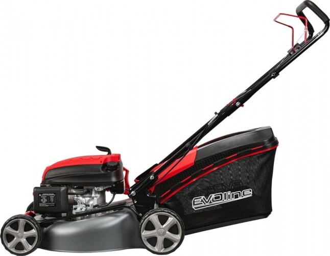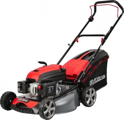 Газонокосилка бензиновая EVOline LMG 46 CP - имеет ширину кошения 46 см и металлическую деку. Двигатель косилки TREX Y170V OHV объемом 170 куб.см и мощностью 3,9 л.с.