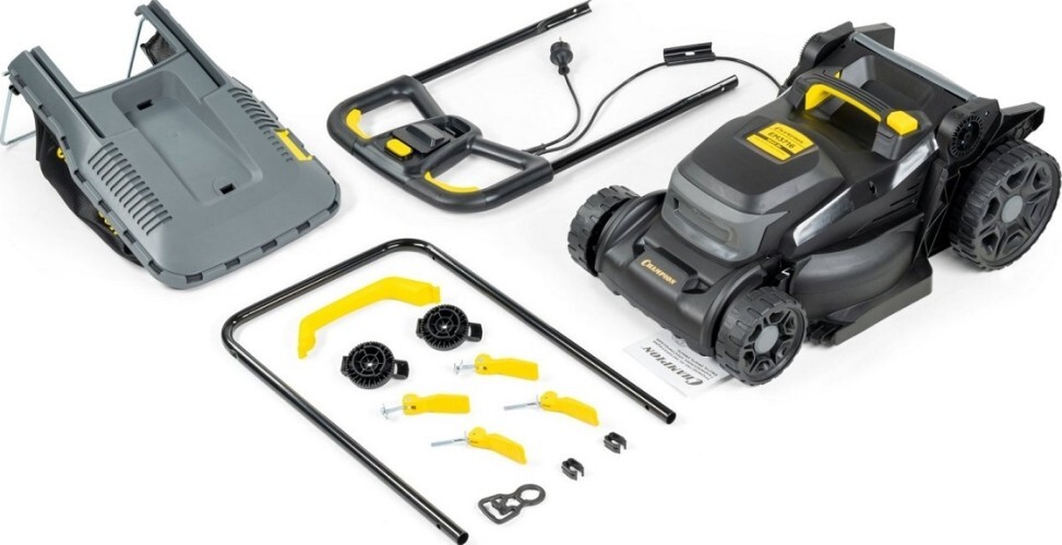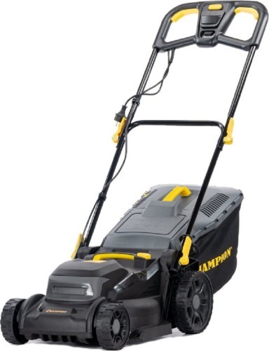 Газонокосилка электрическая CHAMPION EM3716 — мощная и удобная модель с двигателем 1600 Вт, шириной скашивания 37 см и регулируемой высотой от 25 до 75 мм (7 позиций).