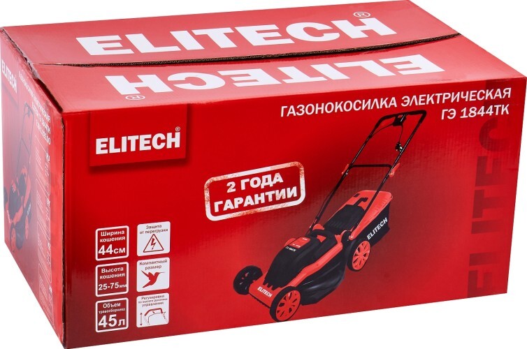 Газонокосилка электрическая ELITECH ГЭ 1844ТК предназначена для кошения газонной травы на приусадебных и дачных участках, в парках и аналогичных территориях с газонным травяным покрытием, ровным, без ям и кочек, и без посторонних предметов. Предпочтительные условия для эксплуатации газонокосилки: температура окружающего воздуха от +5°С до +35°С и относительная влажность воздуха не более 80%.