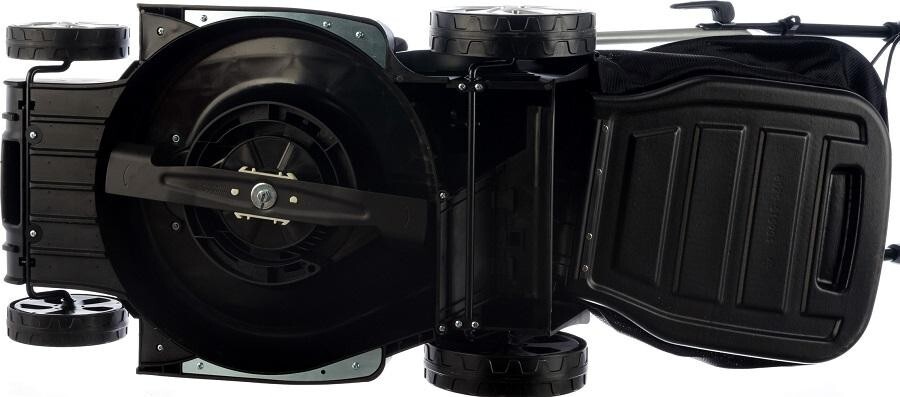 Травосборник объемом 45 литров выполнен в виде мягкого контейнера с жестким верхом с индикатором заполнения, что избавляет от необходимости постоянной проверки. Выброс травы осуществляется назад, в травосборник, обеспечивая чистоту участка после кошения.