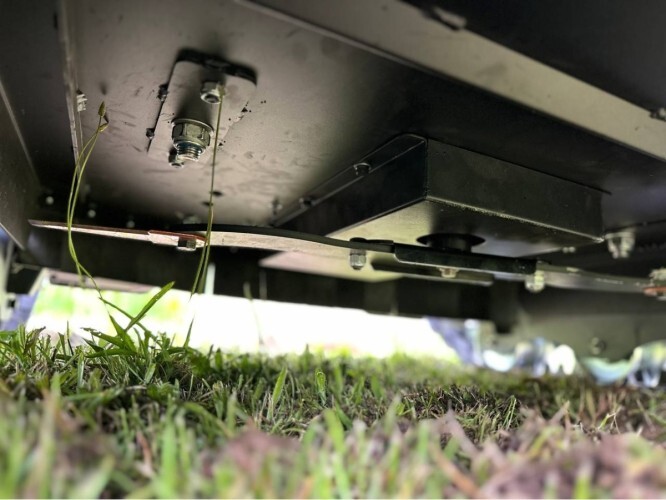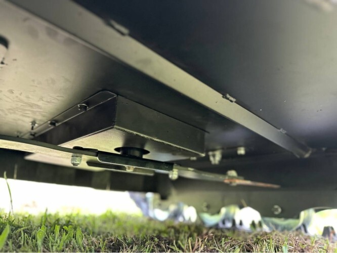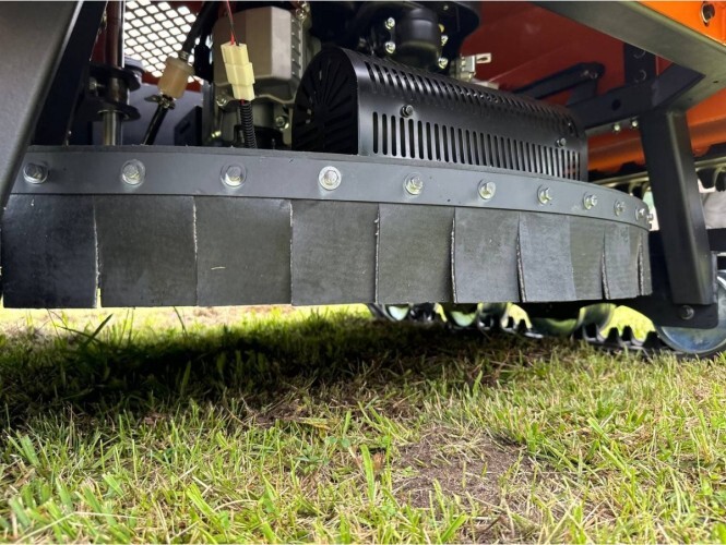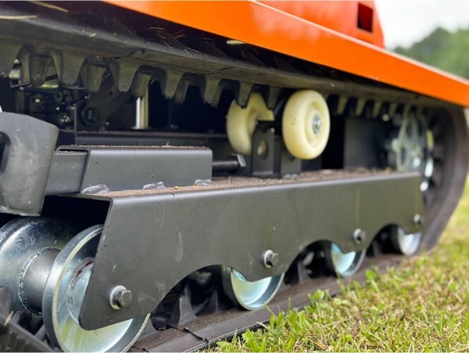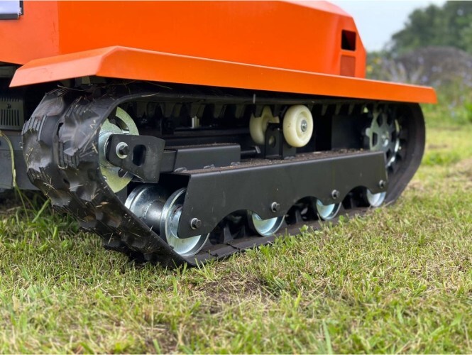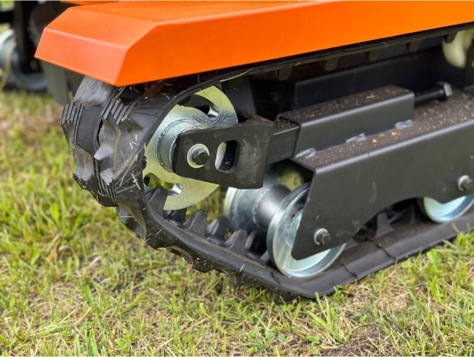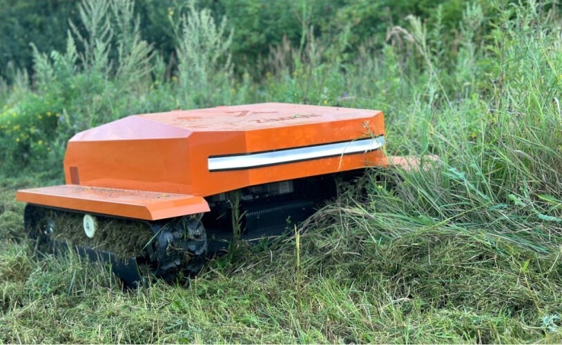 Гибридная силовая установка, сочетающая бензиновый двигатель мощностью 30 л.с. и электрические приводы гусеничного хода, обеспечивает проходимость и производительность. Агрегат легко справляется с густой травой, жестким бурьяном и даже молодым кустарником, демонстрируя стабильную работу на участках с любым рельефом – будь то крутые склоны, неровности или сложный ландшафт с препятствиями.