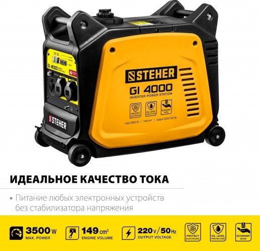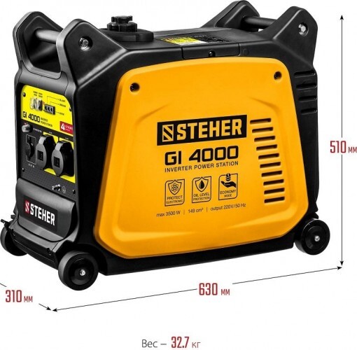 Мощный источник электроэнергии 3.5 кВт для электроснабжения торговых объектов, для работ на стройке или в качестве резервного электроснабжения летнего дома. За счет бака 7.5 л может непрерывно работать в течение четырех часов. Шумозащитный корпус значительно снижает шум двигателя. Идеальное качество вырабатываемого тока позволяет использовать станцию для питания любых электронных устройств без стабилизатора. Дополнительный выход на 12 В дает возможность подзарядки аккумуляторов.