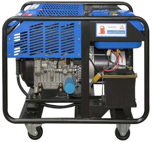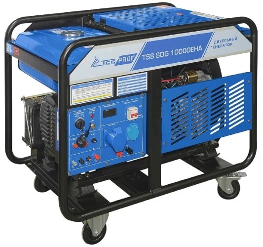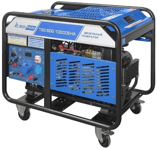 Дизель генератор TSS SDG 10000EHA с надежным и экономичным двигателем, электростартером и разъемом для подключения блока АВР. Для удобства передвижения оснащенный колесным комплектом.