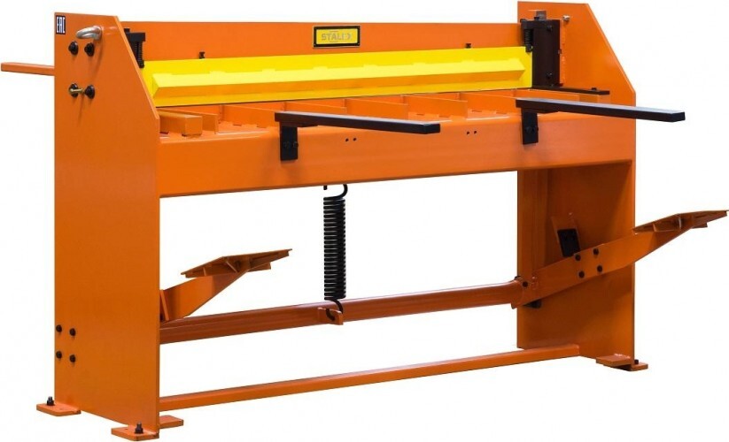 Модель оснащена резаками из высокоуглеродистой стали и механизмом надежного прижима листа. Гильотина имеет ограничитель глубины подачи заготовки до 800 мм и ножную педаль.