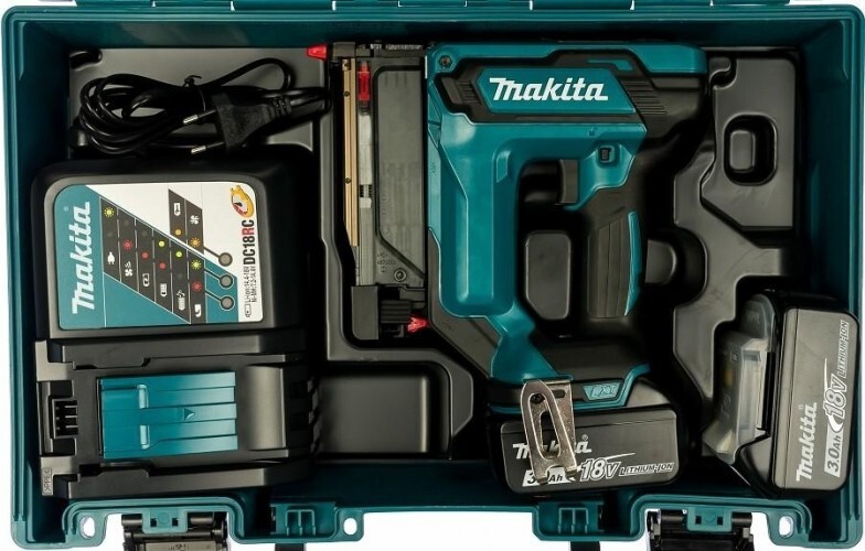 Скобозабиватель аккумуляторный MAKITA DPT 353 RFE - беспроводной инструмент.Источником питания служат Li-Ion батареи напряжением 18В. В комплекте две батареи емкостью 3.0 Ач каждая. Вместимость обоймы 130 рассчитана на гвозди различных размеров. Небольшой вес и продуманная форма инструмента дают возможность использовать его с удобством и без особой усталости. Глубина забивания подлежит регулировке. Для качественной работы в местах с недостаточным освещением есть встроенная светодиодная подсветка с функцией послесвечения.