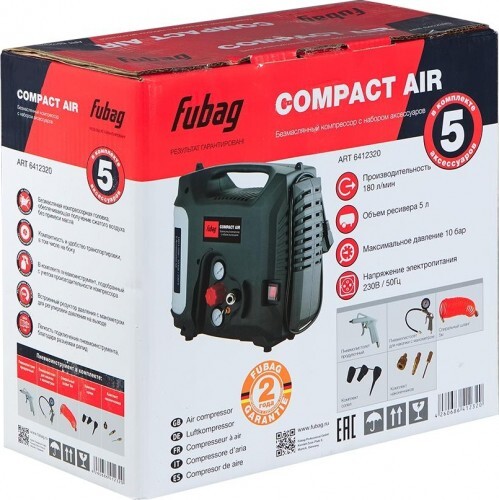 Compact Air - компактный безмасляный компрессор с ресивером 5 литров и набором из пяти предметов. Легко справится с накачкой колес, мячей и матрасов, а также продувкой компьютеров, фильтров и радиаторов.