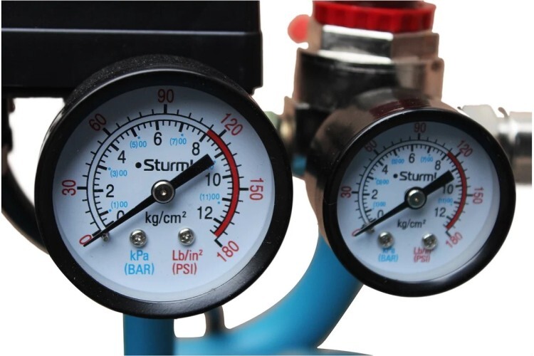 Безмасляный компрессор с 2-х цилиндровым мотором с пониженным уровнем шума, с увеличенным количеством оборотов 2650 об/мин, с двумя шлангами для нагнетания давления обеспечивает поднятие давления в 50-ти литровом ресивере с 0 до 8 атмосфер за 2 минуты; Защита от перегрева и Защита от перегрузки предохраняют компрессор от критических состояний. Реле и регулятор давления на входе и выходе с манометрами позволяют создавать давление максимально приближенное к требуемому потребителем, а также наглядно наблюдать и контролировать возможные перепады или недостатки компрессии.