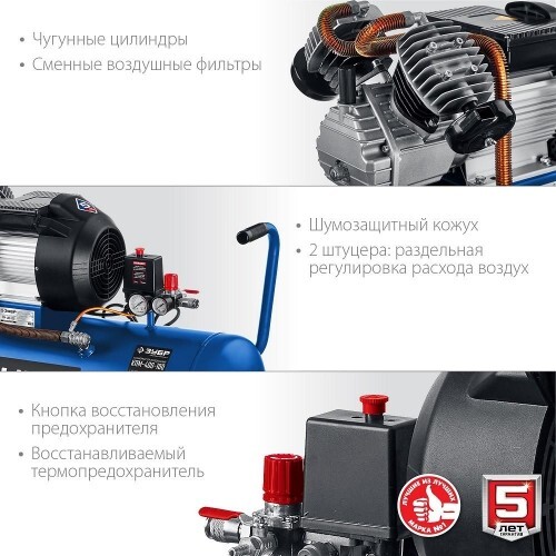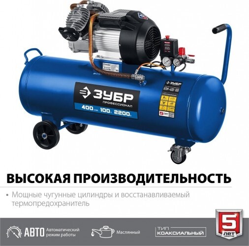 Компрессор поршневой ЗУБР КПМ-400-100 отличается увеличенным ресурсом, возможностью подключения двух инструментов, раздельно регулировать расход воздуха через каждый и автоматическим режимом работы изделия.