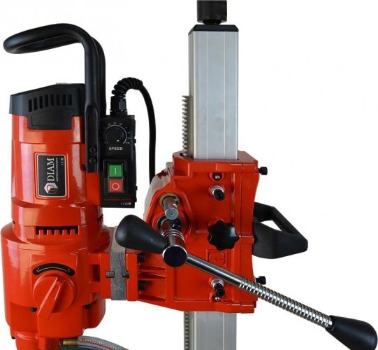 Сверлильная машина состоит из алюминиевой станины (стойки) с основанием и электродвигателя, закрепленного на рабочей каретке, которая перемещается по стойке с помощью стальной зубчатой рейки. Сверлильная машина имеет узел подвода воды с краном, электрическую защиту PRCD от удара электротоком. Также машина снабжена механической фрикционной муфтой, которая защищает электродвигатель от резкой нагрузки (заклинивания коронки в бетоне).