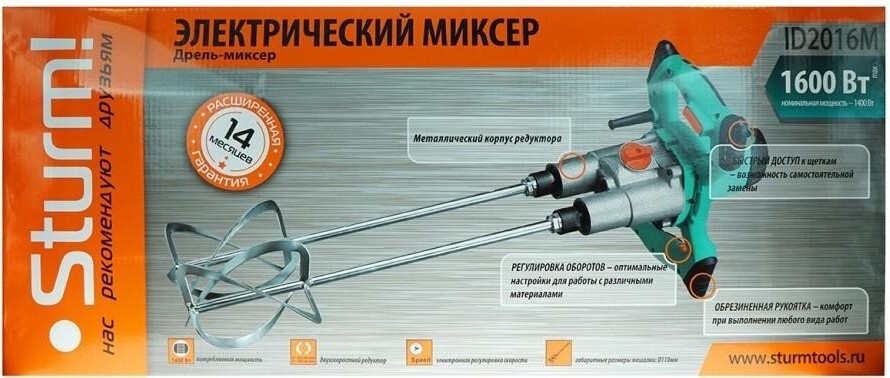 Миксер строительный сетевой STURM ID2016M - это функциональный инструмент для строительных работ. Подходит для перемешивания строительных материалов различной степени вязкости. Данная модель имеет мощный двигатель 1600 Вт.