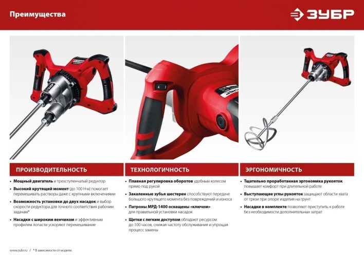 Простой и надежный миксер для перемешивания различных растворов: двухскоростной редуктор для разных материлов, электронная регулировка частоты вращения для плавного изменения, эргономичная рукоятка для удобного хвата. Широкий выбор сменных насадок позволяет работать с разными материалами