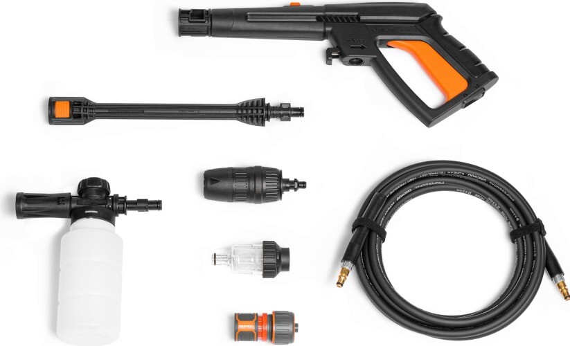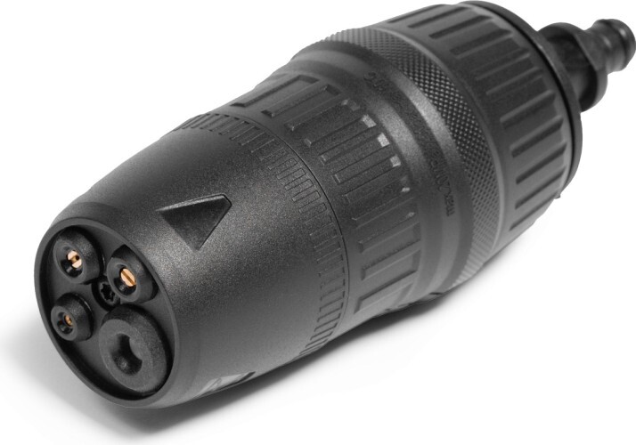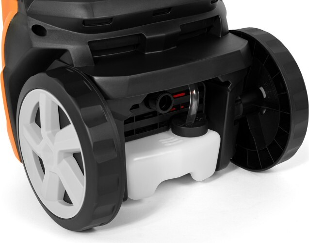 Емкость для моющих средств встроена в корпус мойки, благодаря чему нет необходимости останавливать работу для смены насадок. Подача пены плавно регулируется при помощи встроенной в корпус поворотной рукоятки.
