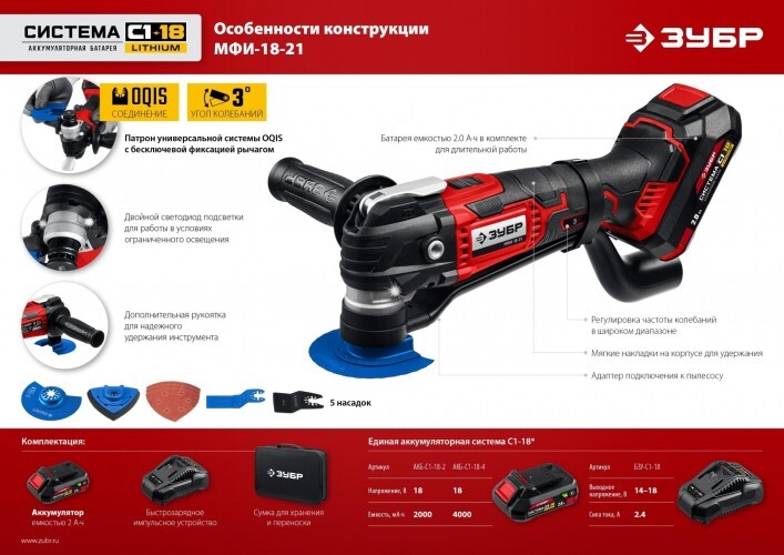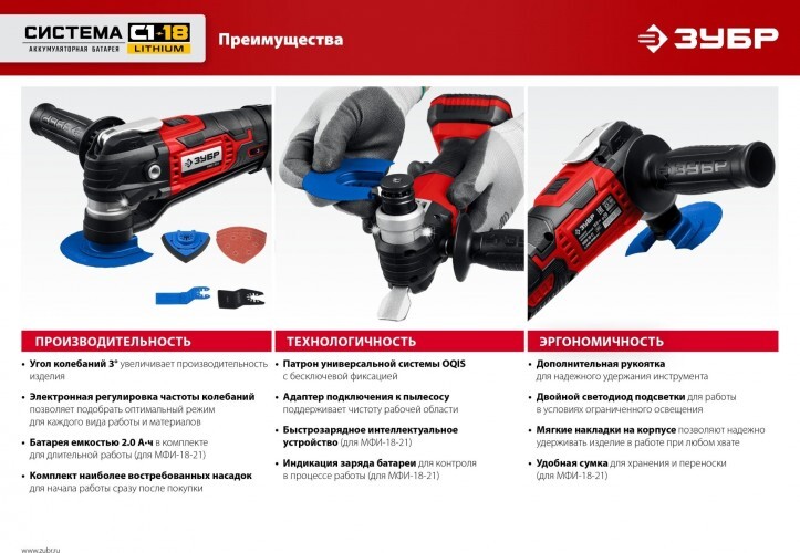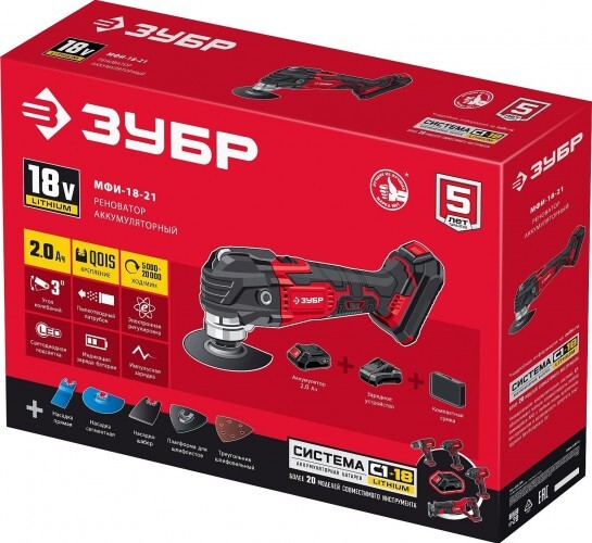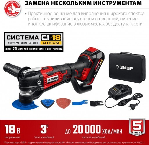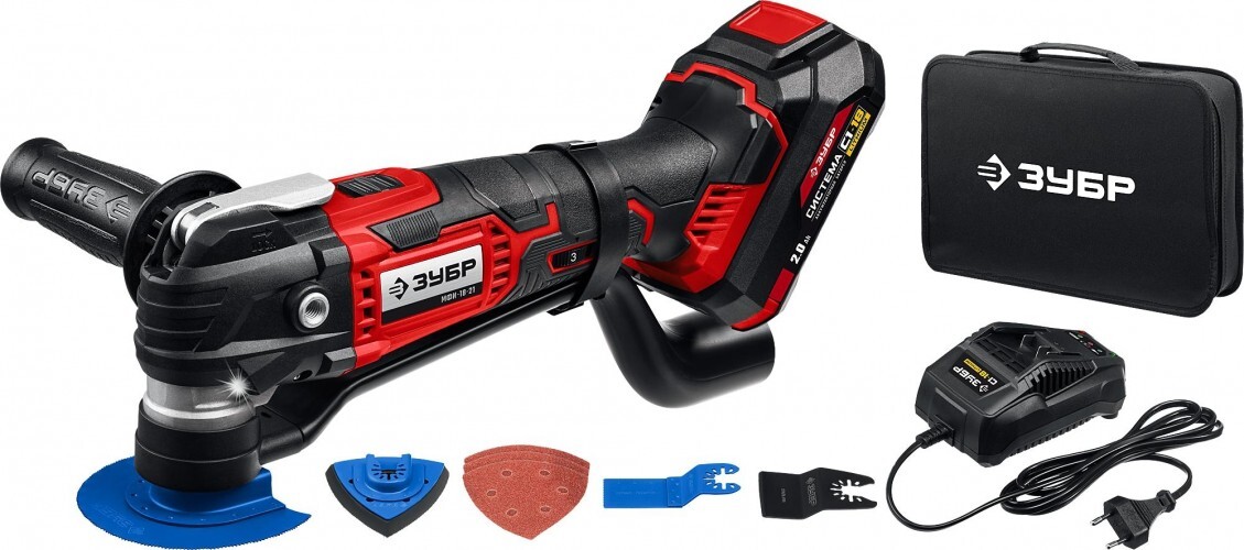Реноватор аккумуляторный с набором насадок ЗУБР МФИ-18-21, предназначен для резки, пилки, шлифовки заготовок из дерева, металла, керамики, пластика и т.д. Компактный инструмент для специфических работ - выпиливание внутренних отверстий, пиление в труднодоступных местах, тонкое шлифование малогабаритных деталей.