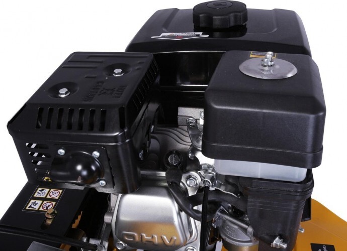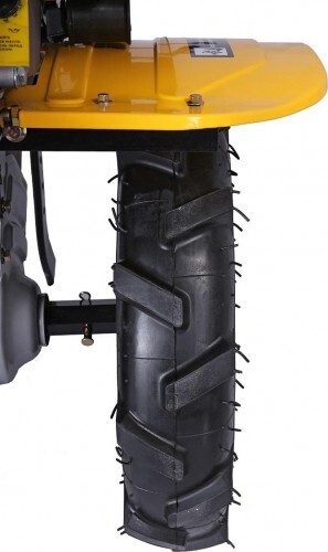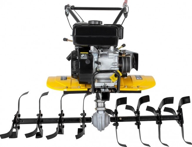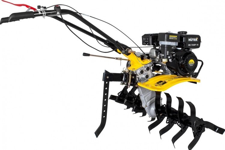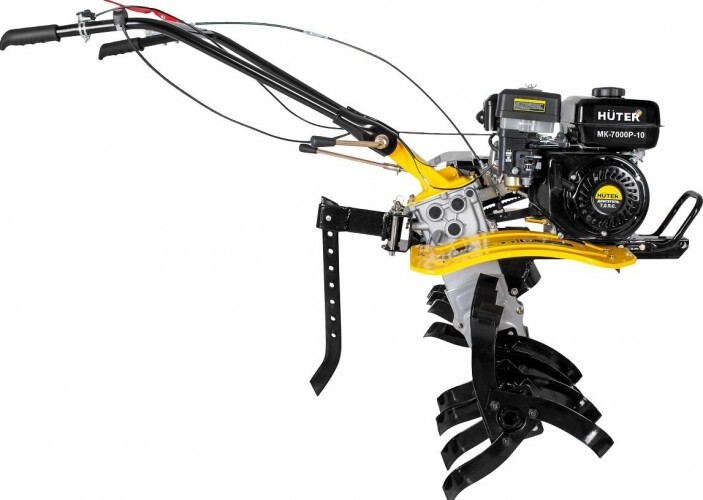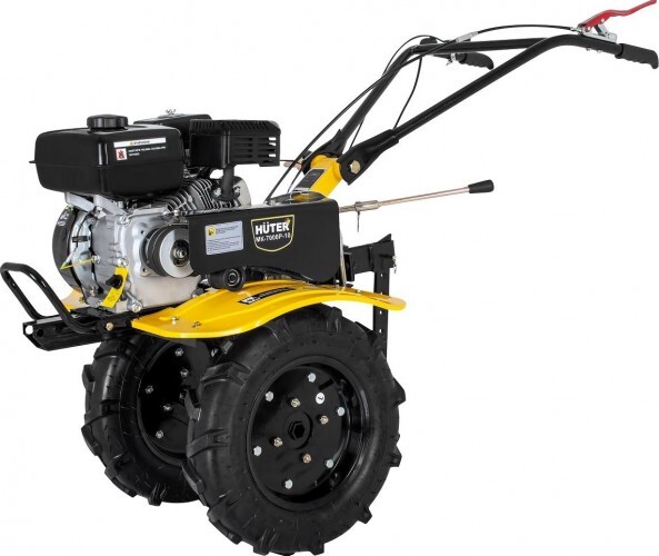 Сельскохозяйственная машина СХМ HUTER МК-7000Р-10 — универсальная машина, которая позволяет выполнять большой список сельскохозяйственных работ. Может вспахивать почву методом разрыхления, в том числе целину, выравнивать борозды после вспахивания трактором, выполнять культивацию. При установке дополнительной оснастки возможно вспахивание с помощью плуга, нарезание канавок, механическое выкапывание картофеля и др. Модель подойдет для обработки приусадебных участков и небольших фермерских, садоводческих хозяйств. Мотоблок HUTER МК-7000Р-10 приводится в действие бензиновым четырехтактным двигателем мощностью 7 л. с. Имеется система защиты от масляного голодания — при критическом снижении масла двигатель остановится, что исключает риск повреждения мотора. Воздушное охлаждение двигателя позволяет работать длительное время без перерывов. В качестве топлива подходит бензин АИ-92 и выше. Бак объемом 3,6 л., расход топлива 375 гр/кВт в час. Редуктор шестеренчато-цепной в масляной ванне, корпус — алюминиевый. Мотоблок имеет 2 передачи вперед и 1 назад. Наличие задней передачи позволяет без труда извлекать мотоблок из почвы. В базовой комплектации идут разборные фрезы. Ширина обработки 100 см. Диаметр фрез: 30 см. Глубина обработки задается с помощью сошника. HUTER МК-7000Р-10 поставляется на колесах 4х10 с резиновыми шинами. Возможна установка грунтозацепов. Тип привода активной навески — ременной, что позволит подключить большое количество российского навесного оборудования. Возможна установка прицепа - в такой комплектации машина подходит для перевозки различных грузов по участку.