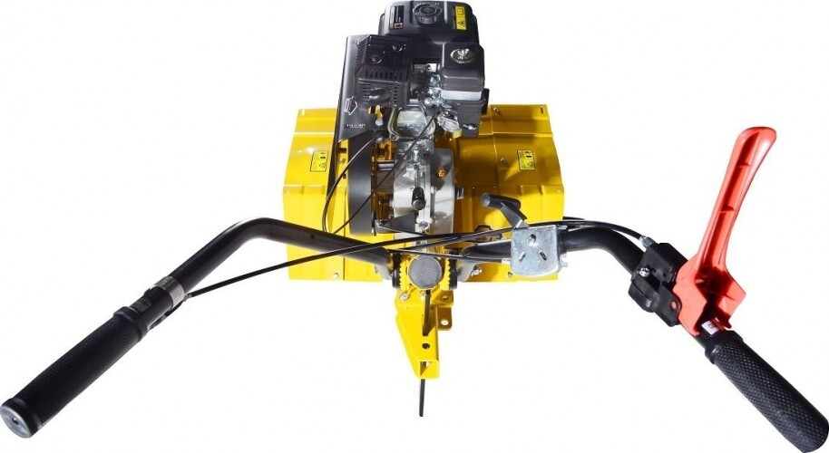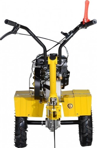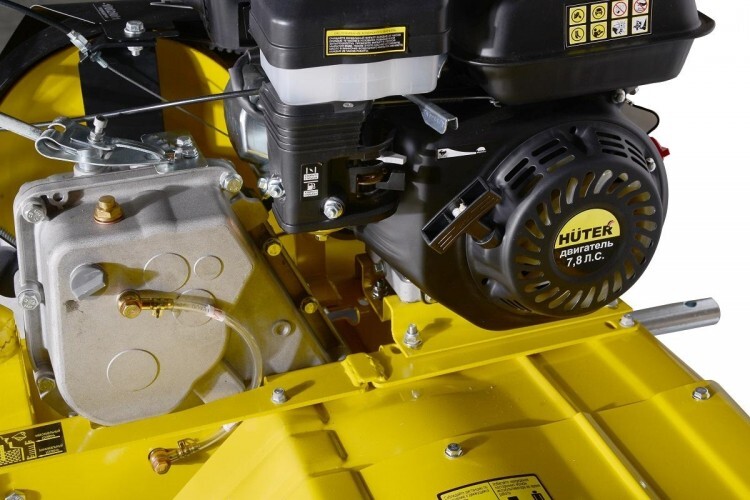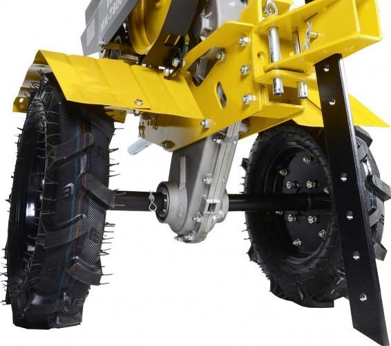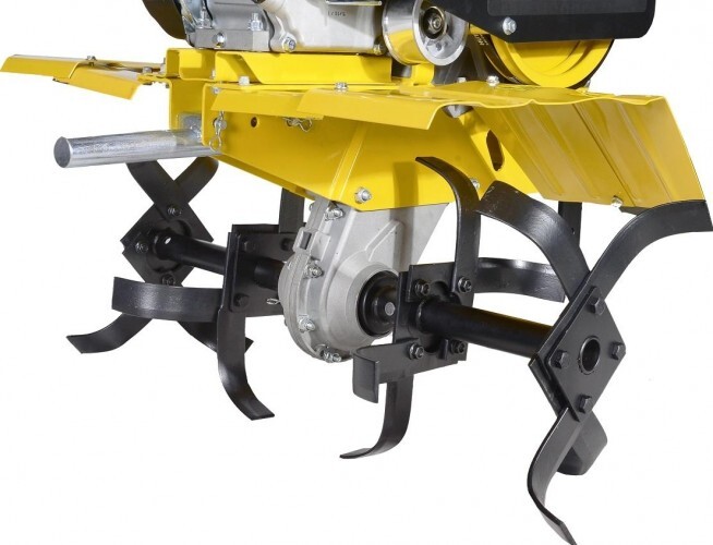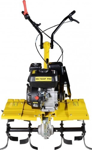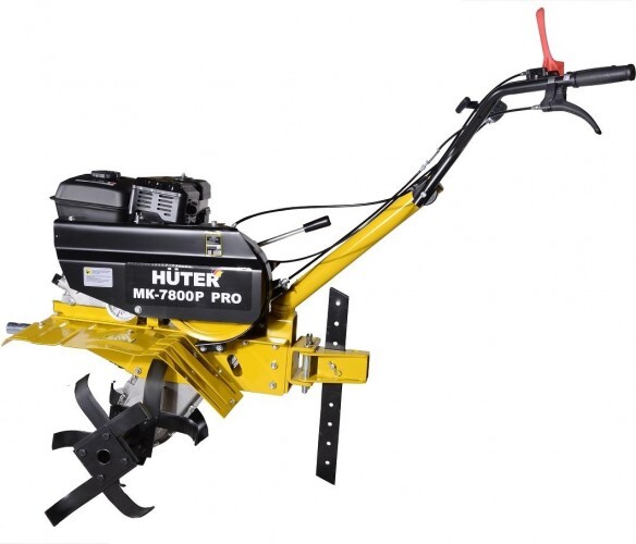 Рекультивировать заросший участок или подготовить грунт под посадку поможет сельскохозяйственная машина HUTER МК-7800P PRO. Благодаря установленному одноцилиндровому четырехтактному двигателю мощностью 7,8 л.с. мотоблоку становится под силу любая задача: рыхление, боронование, вспашка, выравнивание. Датчик уровня масла защищает двигатель от работы вхолостую, что предотвращает внезапную поломку. Для заправки бака необходимо 3,6 литра бензина АИ-92, расход топлива составляет 375 гр/кВт в час. Такого объема хватит на непрерывную работу техники в течение нескольких часов. Одним из главных преимуществ модели HUTER МК-7800P PRO является возможность разблокировки дифференциала, что существенно облегчает работу оператора. Мотоблок легче разворачивается в грунте и имеет лучшую маневренность на ограниченном пространстве. Пониженная первая передача повышает качество вспахивания. Машина имеет 4 передачи вперед и 2 назад. Ширина обработанной машиной полосы составляет 85 см. Глубину рыхления задает регулируемый сошник, а закаленные фрезы диаметром 33 см раздробят плотные камни и корни растений. Тип привода сельскохозяйственной машины — ременной, это позволяет использовать большое количество навесного оборудования. Редуктор шестеренчато-цепной в масляной ванне, имеет алюминиевый корпус, который поглощает вибрации и снижает уровень шума. Рычаги управления и переключатель расположены на рукоятках агрегата, благодаря чему оператору достаточно просто привести мотоблок в действие. Металлический щит на корпусе закрывает пользователя от грязи во время вспашки.