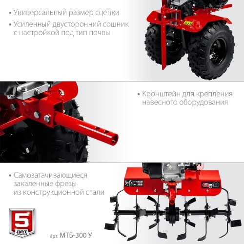 Мотоблок ЗУБР МТБ-300 предназначен для рыхления и культивации почвы на приусадебном участке. Кронштейн для крепления навесного оборудования и шкив отбора мощности позволяют использовать широкую гамму навесного оборудования: снегоуборщик, щетку, роторную косилку. 2 скорости вперед (основная и повышающая) и 1 назад позволяют комфортно работать на любых типах почвы.