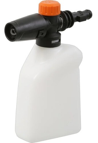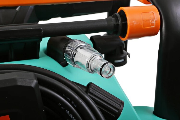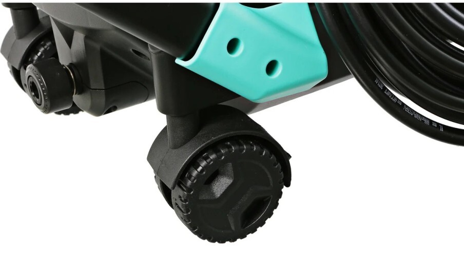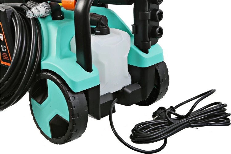 В конструкции мойки предусмотрено 4 колеса: 2 основных для перемещения в вертикальном положении за ручку и 2 дополнительных поворотных для перемещения в горизонтальном положении за шланг в след за пользователем Увеличенная до 5 метров длина сетевого кабеля и шланга высокого давления до 7 метров обеспечивает большую рабочую зону 452 квадратных метра. А подвижность мойки в сочетании с садовым удлинителем делает рабочую зону практически не ограниченной в пределах владений пользовтаеля. В комплекте три фрезы: веерная, turbo-грязевая, угловая. Это позволит пользователю работать с загрязнениями любой степени и в любых местах. Регулировка мощности позволяет переключать мойку в режим ECO для работ, не требующих максимального давления. Для работы с моющими средствами мойка оснащена встроенным бачком для подачи эмульсии и внешним пеногенератором с регулировкой густоты пены.