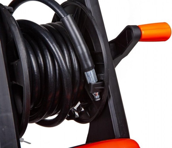 Увеличенный до 7м эластичный шланг высокого давления на барабане позволяет свободно мыть автомобиль, чистить крыши дачных построек и другие объекты не передвигая мойку. Благодаря своей эластичности шланг легко разматывается и сматывается на барабан, не спутывается во время работы