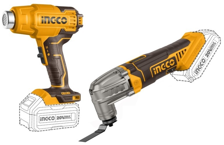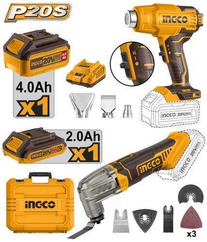 Набор фен и реноватор INGCO COSLI230703 включает в себя аккумуляторный реноватор и фен на единой платформе P20S