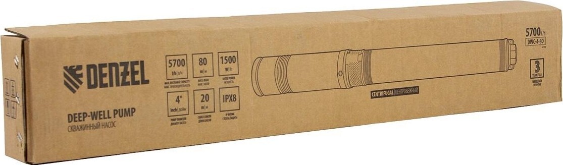 Центробежный скважинный скважинный насос Denzel DWC-4–80 легко справляется с перекачиванием чистой воды и поднимает ее на высоту до 80 м. С помощью насоса можно организовать водоснабжение частного дома, полив или орошение грунта, осушение колодца и другие бытовые цели. Вода забирается из пресных водоемов, скважин, накопительных резервуаров и может содержать твердые частицы размером до 0,5 мм.