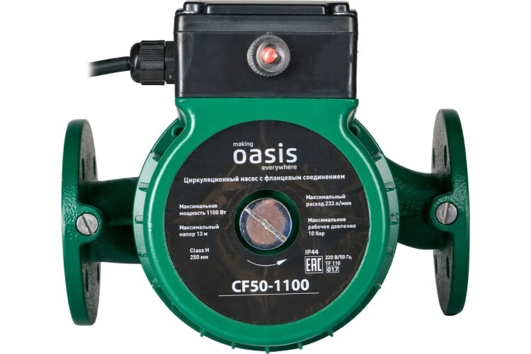 Циркуляционный насос с фланцевым соединением making Oasis everywhere CF50-1100 - это прибор, который выполняет циркуляцию воды в замкнутой системе отопления. Он особенно полезен в загородных домах площадью более 100м^2, так как в таких условиях естественная конвекция не может обеспечить равномерный прогрев всех отопительных приборов.