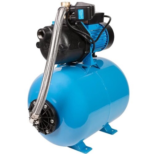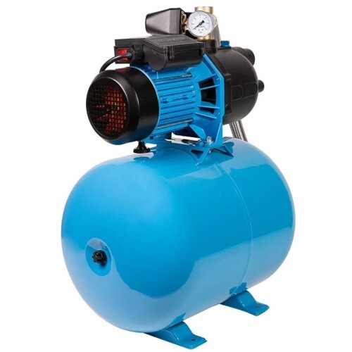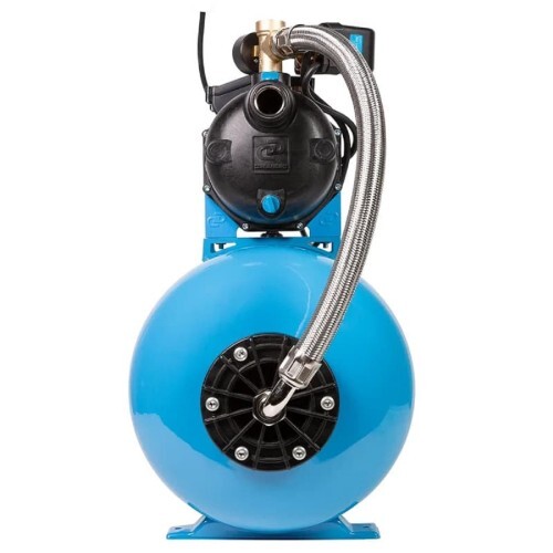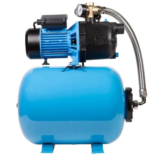 Насос-автомат с системой автоматического управления по давлению состоит из поверхностного насоса, горизонтального объемом 24 л. гидроаккумулятора, реле давления, манометра, соединительной арматуры и электрошнура с вилкой.
