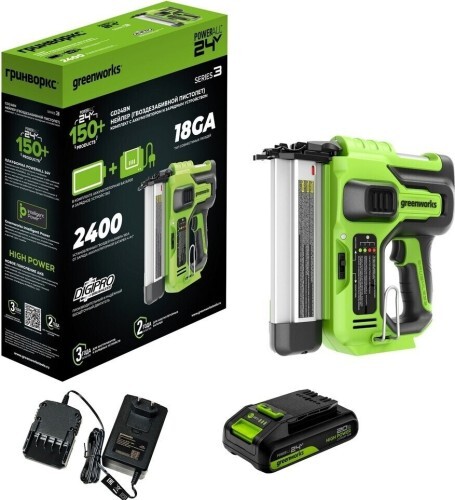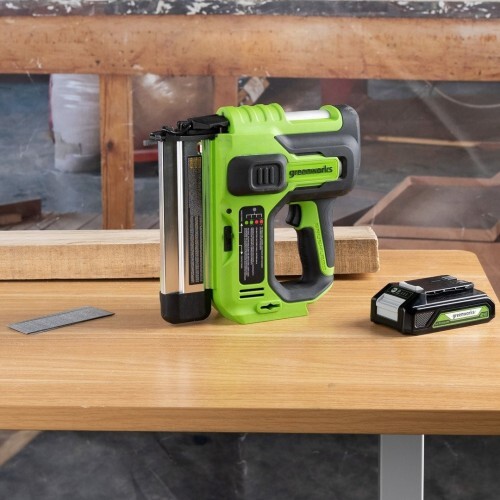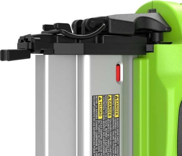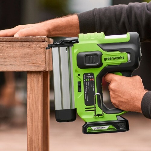 Нейлер GD24BN обладает высочайшей производительностью осуществляя до 1200 выстрелов от одного заряда аккумуляторной батареи Greenworks 24V ёмкостью 2 Ач.